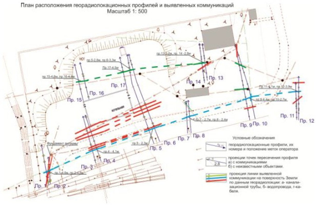 Пример плана георадарных профилей на местности и вынесенных на него коммуникаций