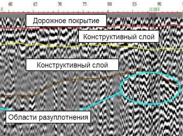 Пример георадарного расчленения разреза с выявленной областью разуплотнения.